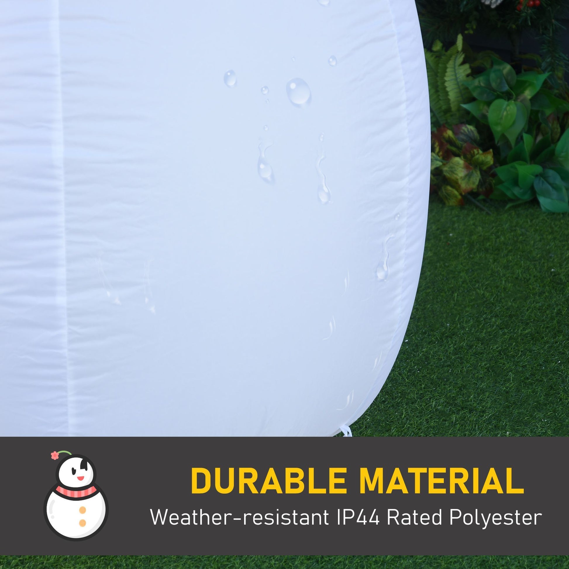 - Mild Rain Or Snow? No Problem: For those more temperamental Christmas, you're still going to want to display your holiday spirit. The outdoor Christmas decoration is made of IP44 rated polyester cloth that is waterproof to withstand outdoor weather.