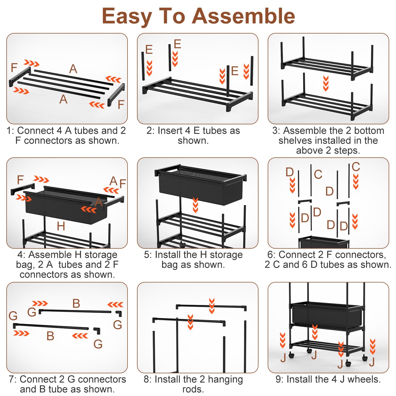 - *3 Tiered Clothes Rack*: Our double rods clothing garment rack combines a clothing rack,storage bag and shoe rack,multifunctional but sleek,perfectly blending in with the rooms in your home,whether it's a bedroom,living room,laundry room or entryway.
