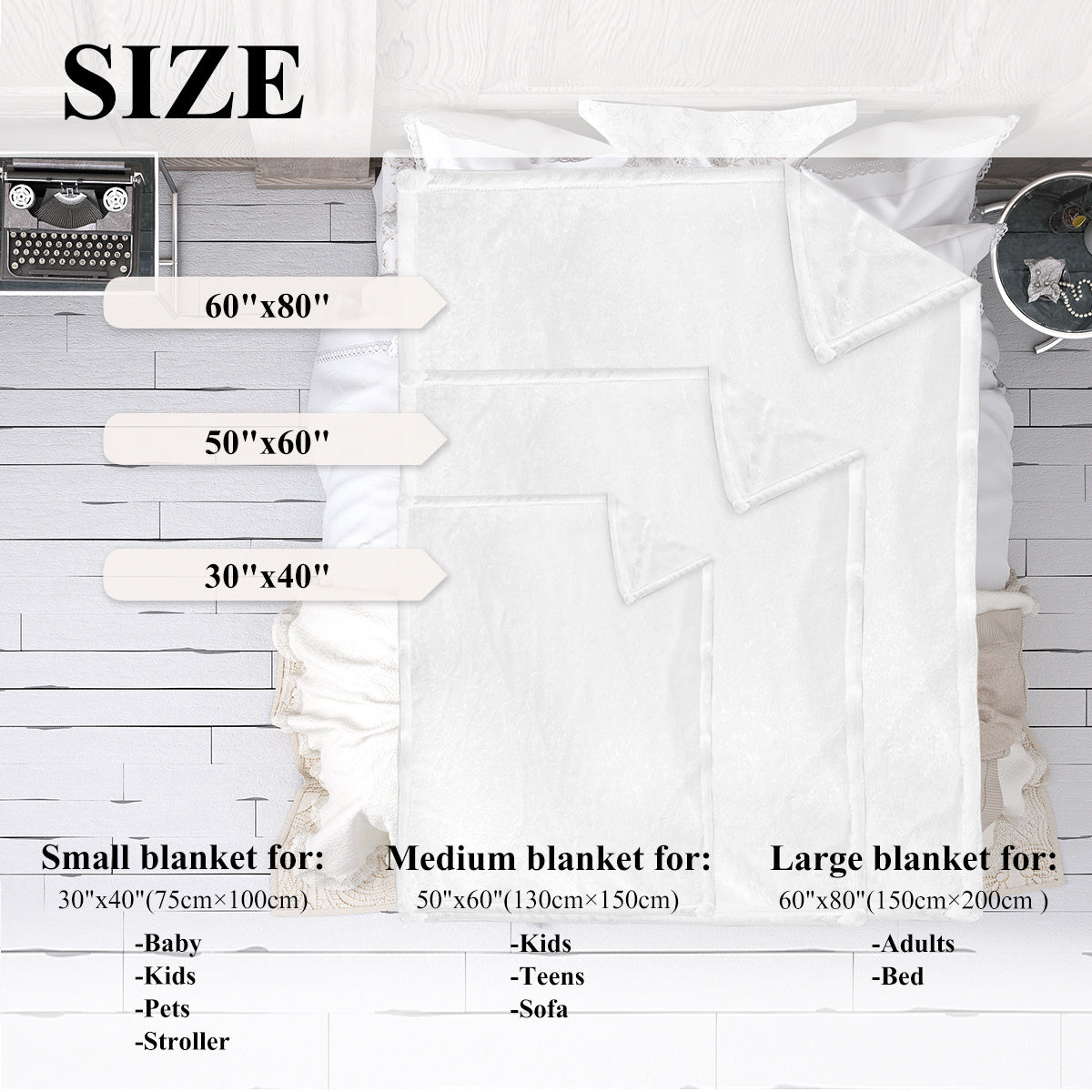SIZE - 50"x60", 60"x80",big enough for one person as a throw, covers feet up to shoulder level.